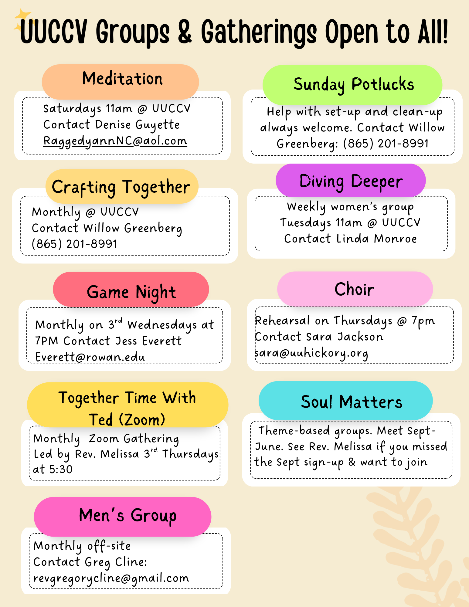 For details, subscribe to our newsletter, Currents, which has everything that’s happening in the life of our congregation. If you have any questions, contact uuhickory@gmail.com